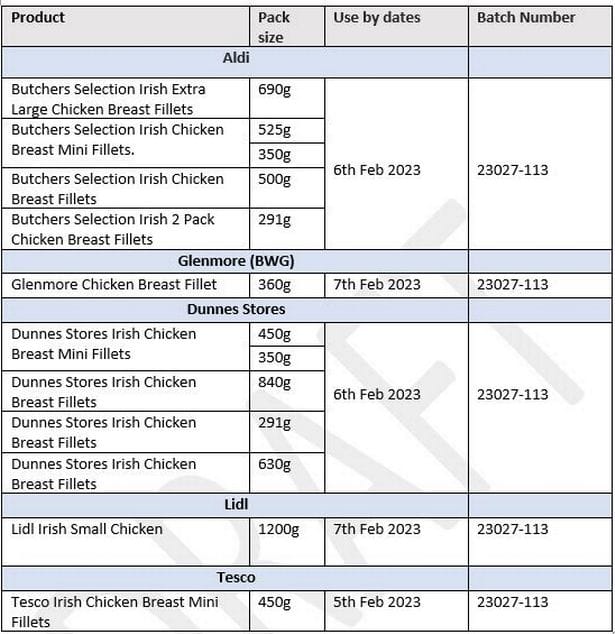 أصدرت هيئة سلامة الأغذية في أيرلندا تحذير من بعض المنتجات الغذائية من الحلويات واللحوم بسبب مخاطر تتعلق بالسلامة الغذائية في جميع محلات السوبر ماركت في أيرلندا منها Dunnes, Lidl, Tesco) SuperValu, Aldi).