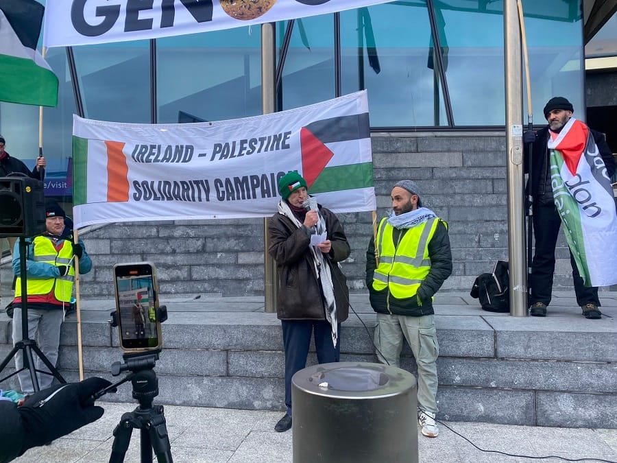Great speeches today at the Central Bank, as IPSC protested them selling Israeli war bonds. Outrageous. While children are bombed and heroic doctors tortured. #GazaGenocide pic.twitter.com/DUVj5sUacQ