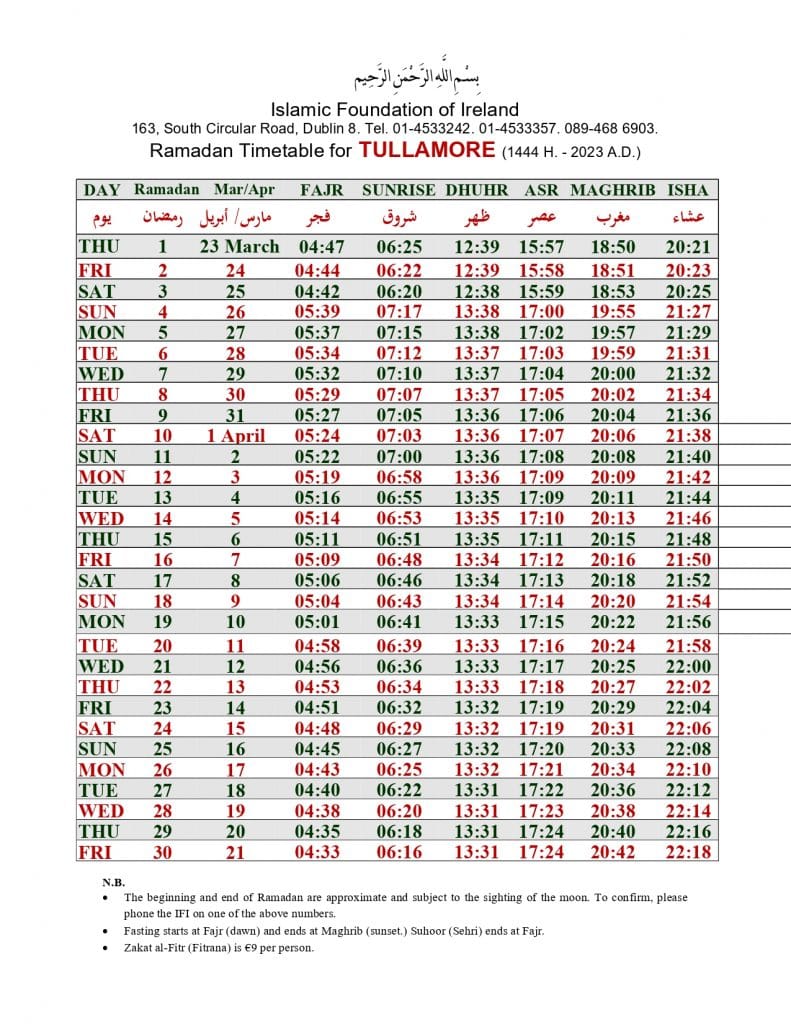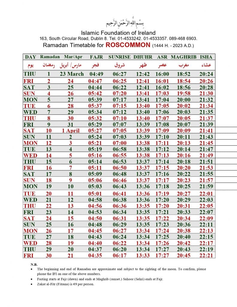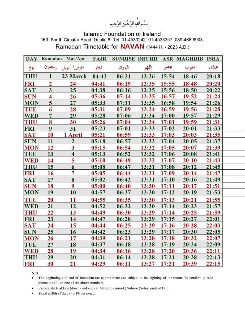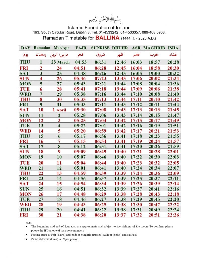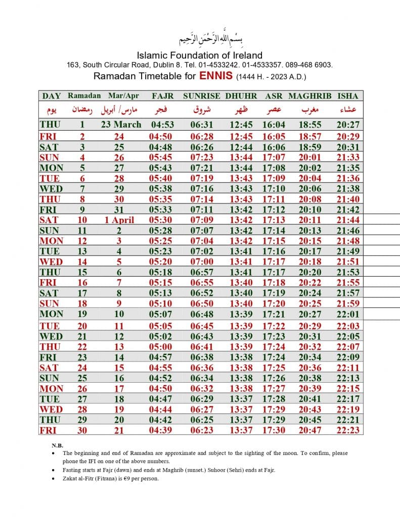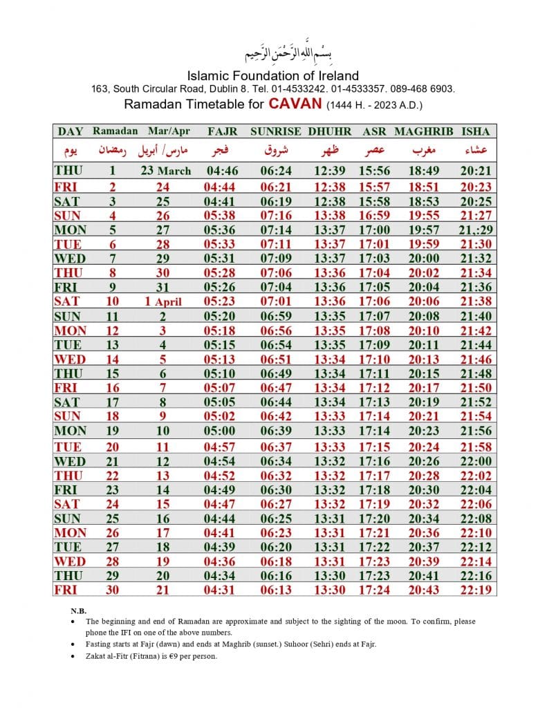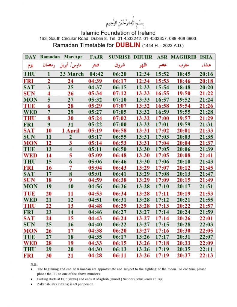 الهيئة الاسلامية في أيرلندا تنشر إمساكية رمضان 2023 لـ 32 مقاطعة