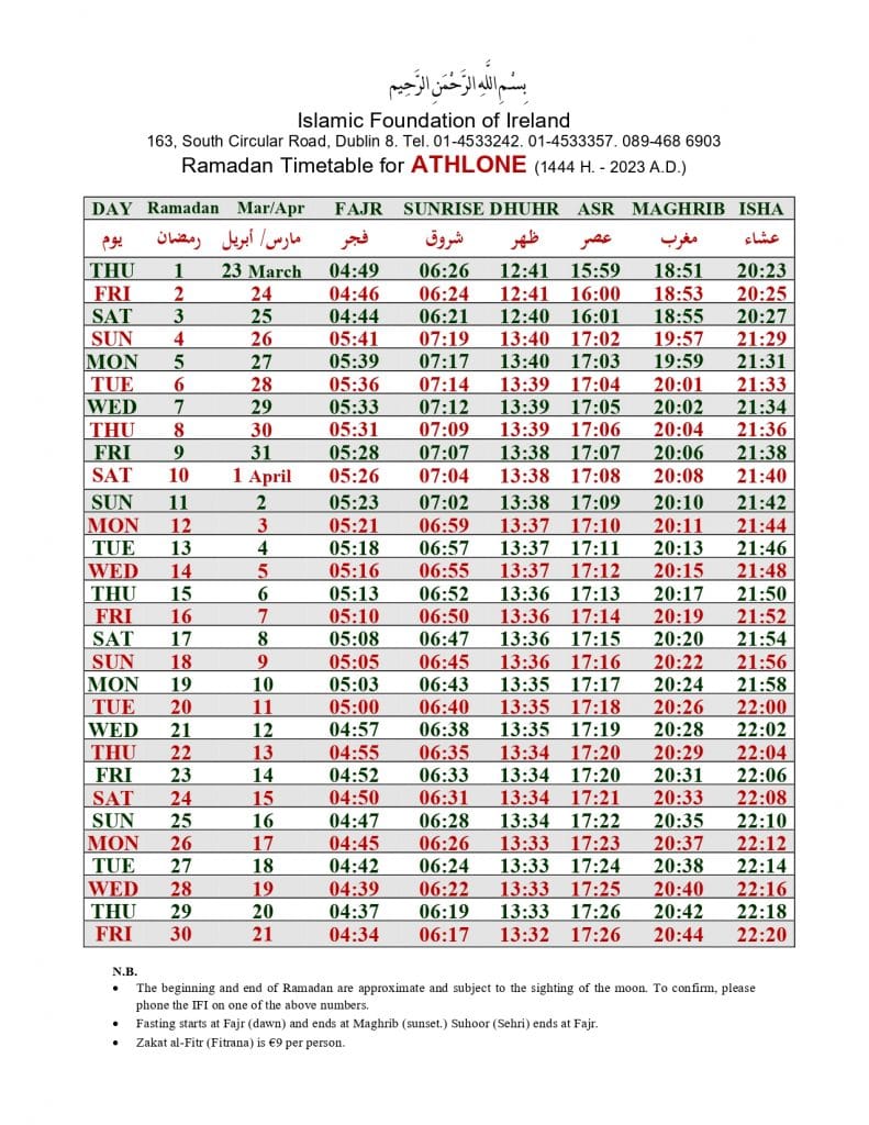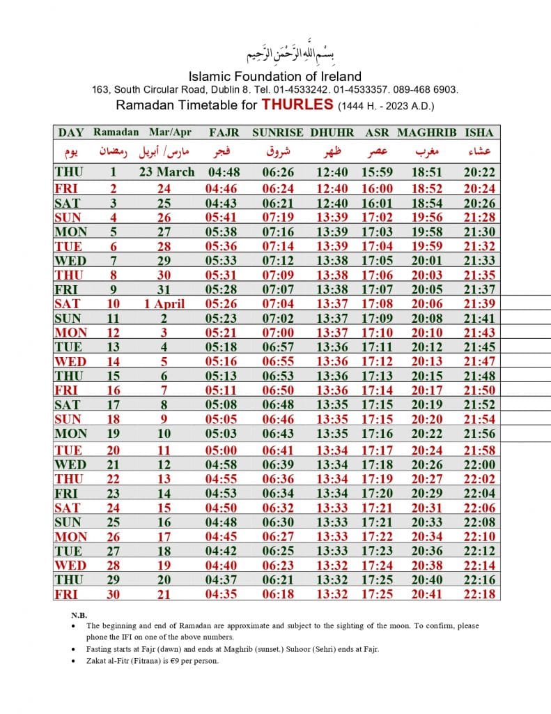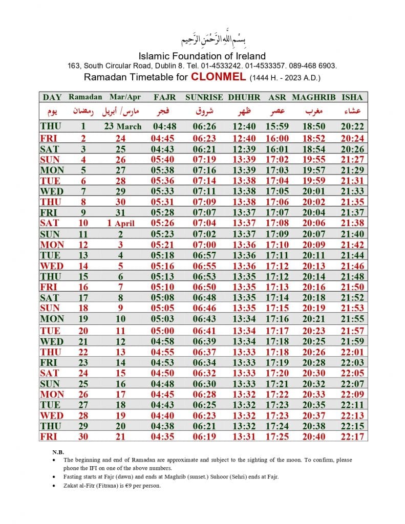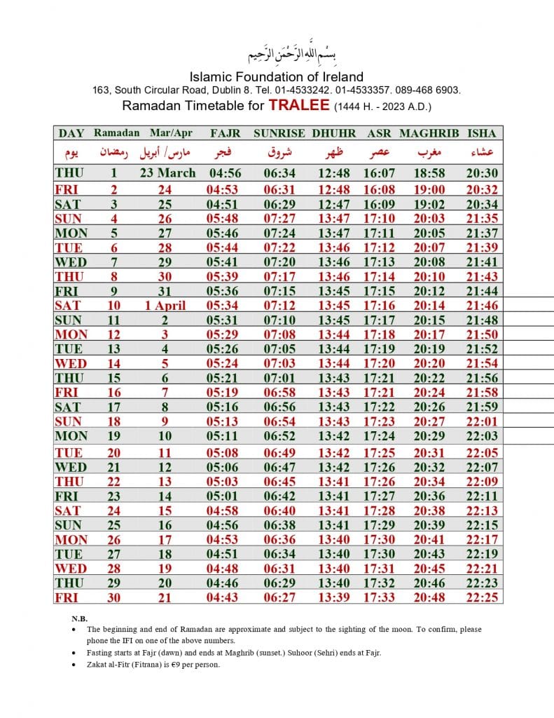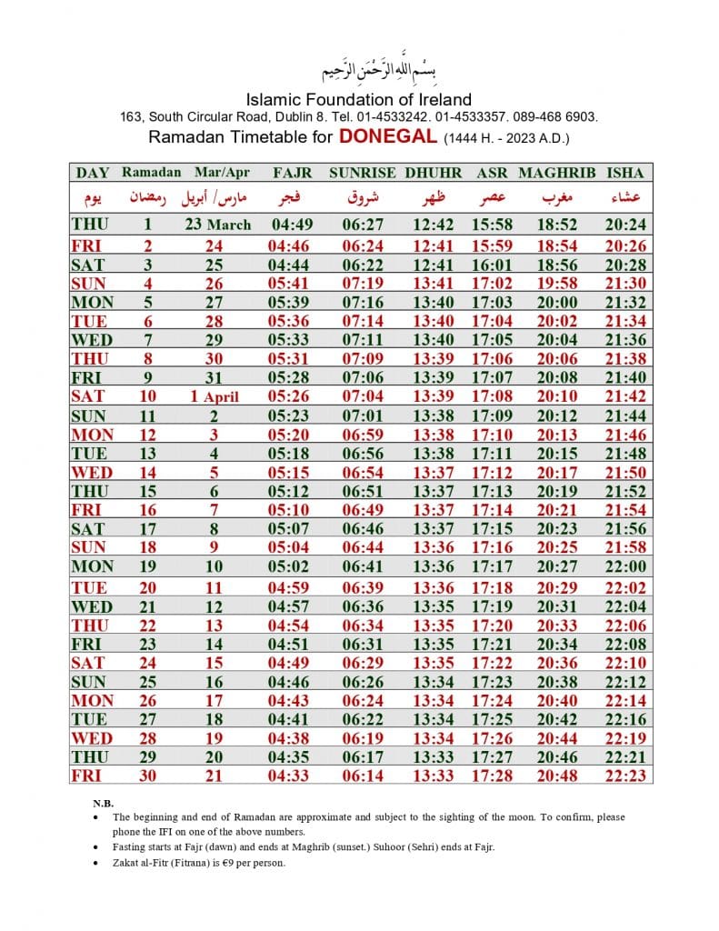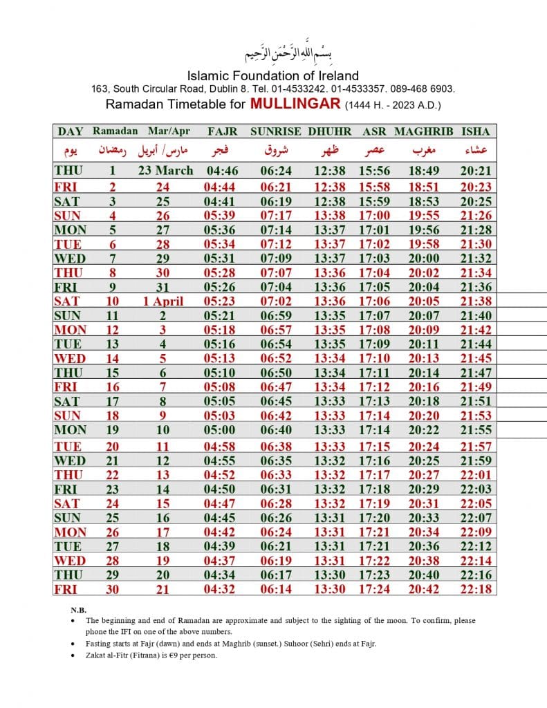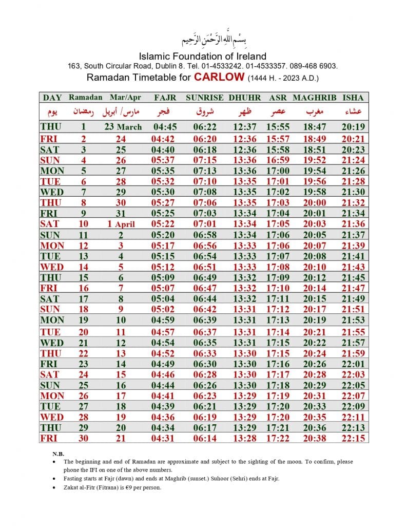 الهيئة الاسلامية في أيرلندا تنشر إمساكية رمضان 2023 لـ 32 مقاطعة
