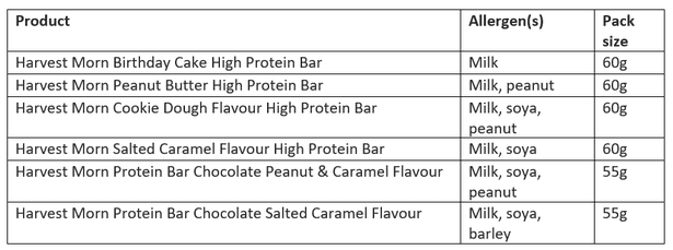 وجاء في الإشعار تحذير من تناول “Harvest Morn Protein Bars” نظرا لوجود مواد مسببة للحساسية معلن عنها بشكل غير صحيح على ملصقاتها، مما قد يجعلها غير آمنة للاستهلاك، خاصة للمستهلكين الذين لديهم حساسية تجاه الحبوب التي تحتوي على الجلوتين والفول السوداني وفول الصويا والحليب.