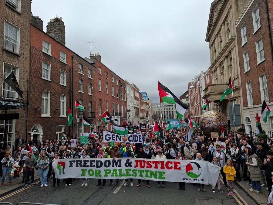 وشهدت العاصمة دبلن مسيرة حاشدة شارك فيها الآلاف، مطالبين الحكومة بفرض عقوبات على إسرائيل. وتجمع المتظاهرون، الذين ارتدى بعضهم الكوفية الفلسطينية ورفعوا الأعلام واللافتات، أمام مبنى لينستر هاوس، حيث أُلقِيت مجموعة من الخطابات.